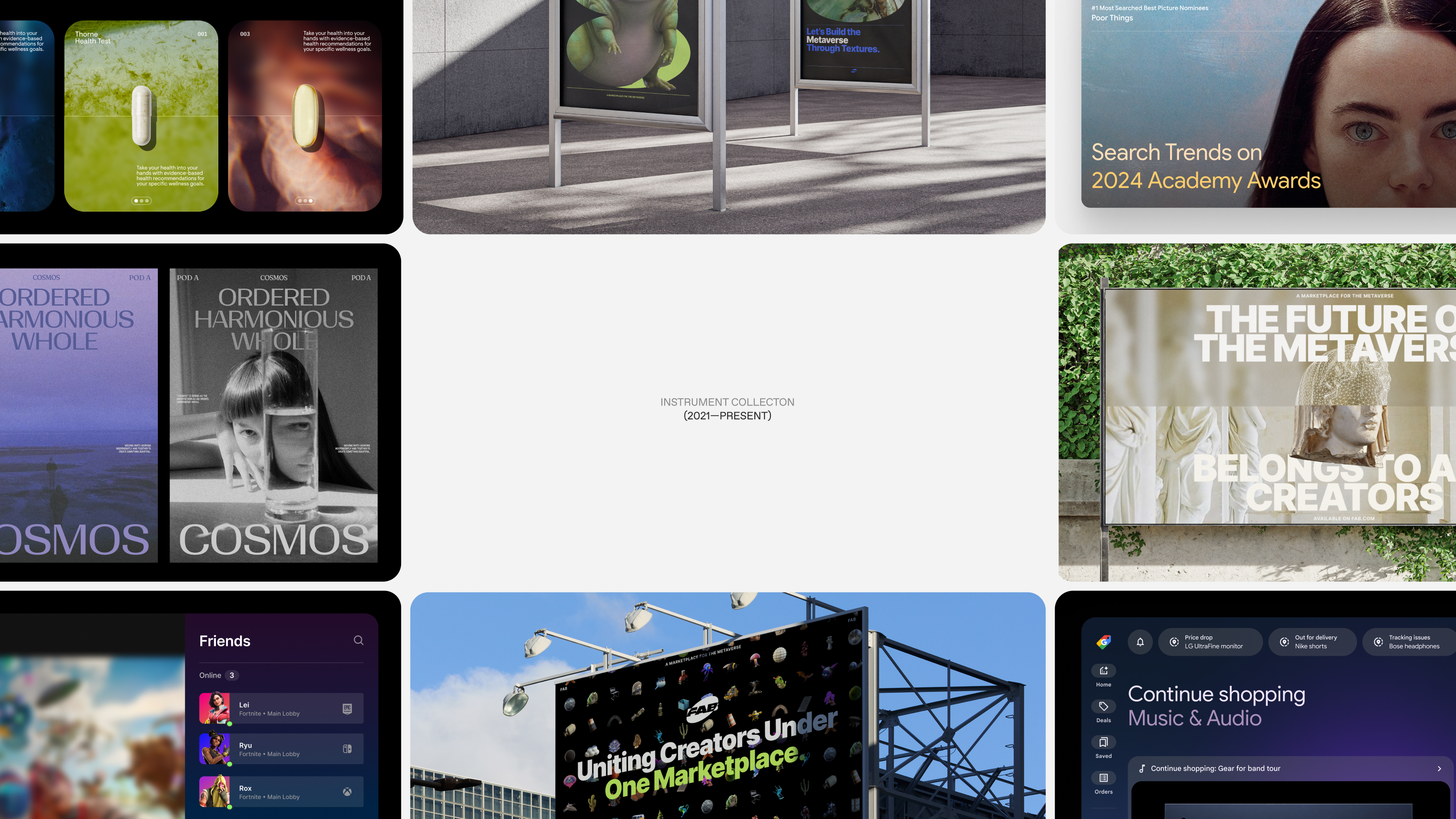 In 2021 I joined Instrument—a design agency that focuses on digital products and brand-centric projects. As both a Senior Designer and Associate Design Director, I've had the opportunity to contribute to work for brands like Epic Games, Google, Thorne, and Converse over the past few years. In those projects, my main responsibilities have included concepting for digital products, helping evolve design systems, and extending brand identities into digital experiences.