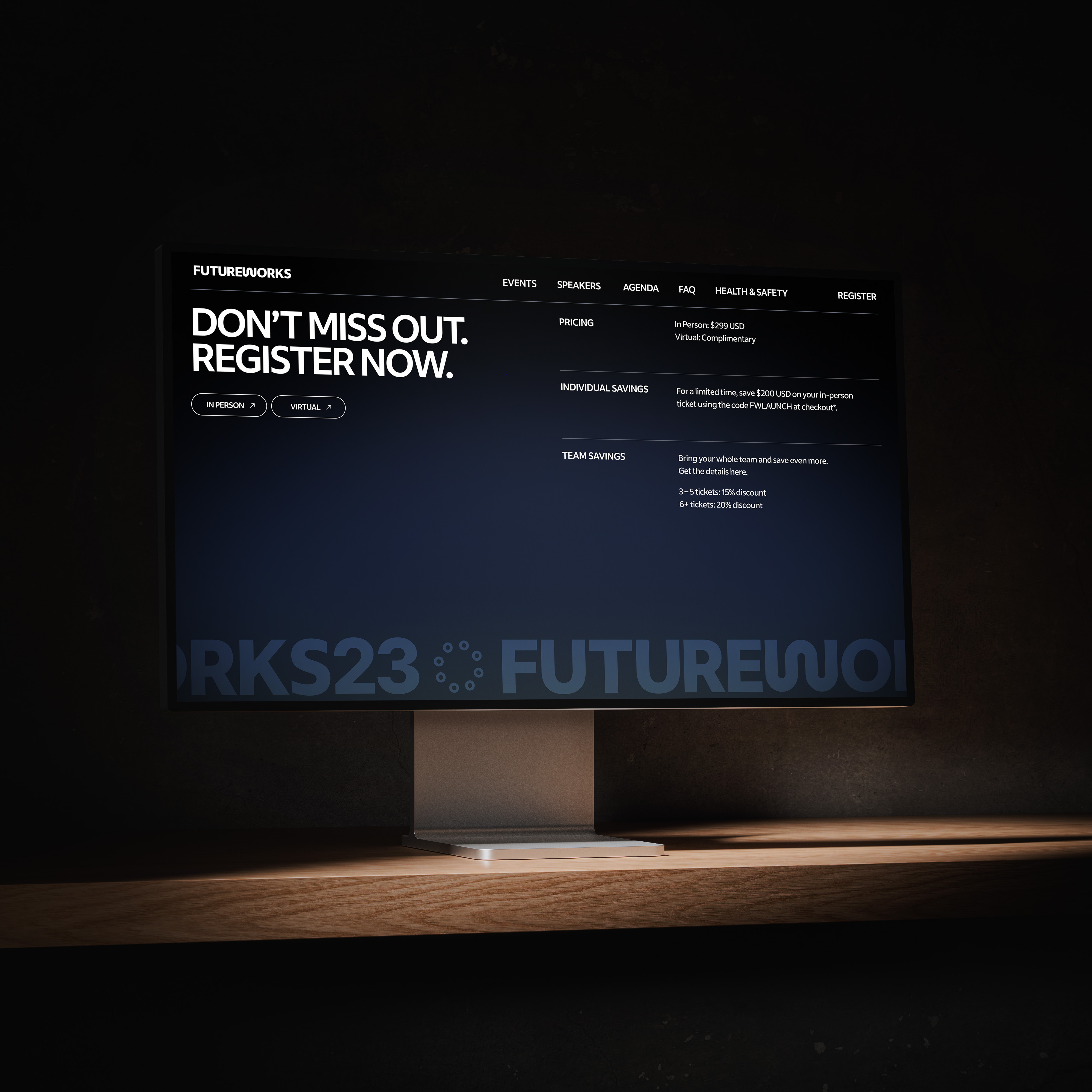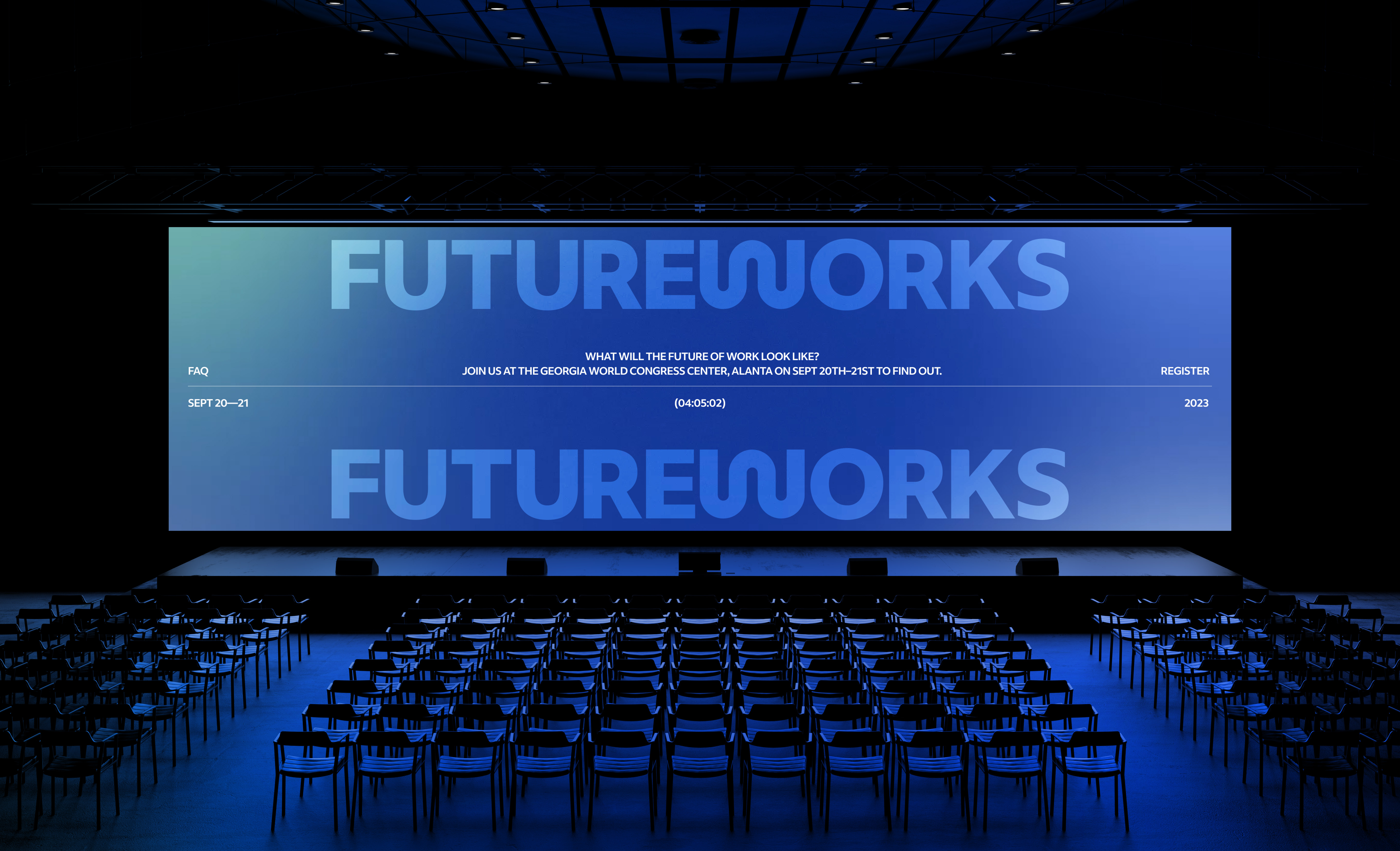 In 2023, we worked with Indeed to build out their brand identity for their annual conference. Our main responsibility was to develop the yearly website's brand, where Indeed employees could learn about the latest events, speakers, and talks that would be held that year. My responsibility was to help develop new creative directions for that year's iteration of futureworks.